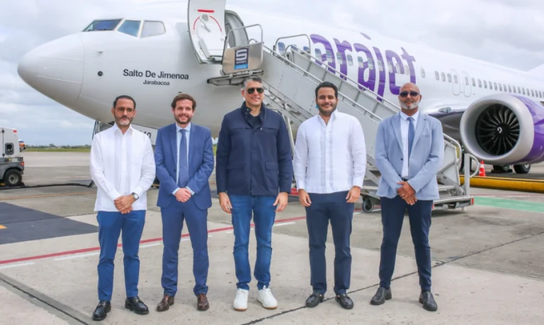 Santo Domingo.- Arajet announced the arrival of its 14th aircraft, a Boeing 737 MAX 8 named “Salto de Jimenoa,” as part of its initiative to highlight the Dominican Republic’s natural heritage. The plane landed at Las Américas International Airport, strengthening the airline’s growing fleet and operational capacity.